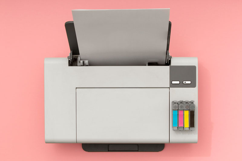 Create text and images by striking an inked ribbon against paper with a series of pins